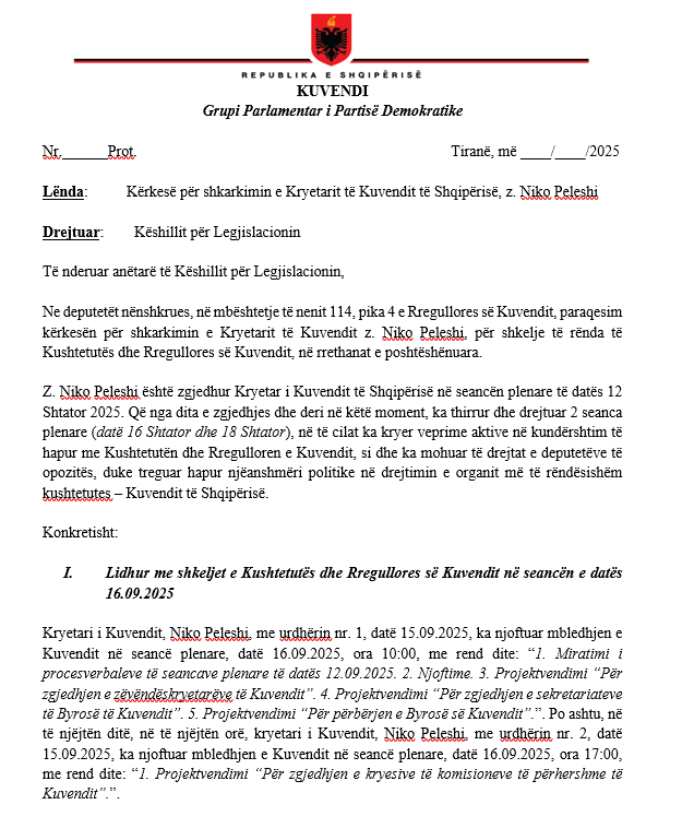 Grupi Parlamentar i Partisë Demokratike ka dorëzuar zyrtarisht kërkesën për shkarkimin e Kryetarit të Kuvendit, Niko Peleshi, duke akuzuar atë për shkelje të rënda të Kushtetutës dhe Rregullores së Kuvendit dhe për njëanshmëri politike në drejtimin e organit më të rëndësishëm kushtetues.