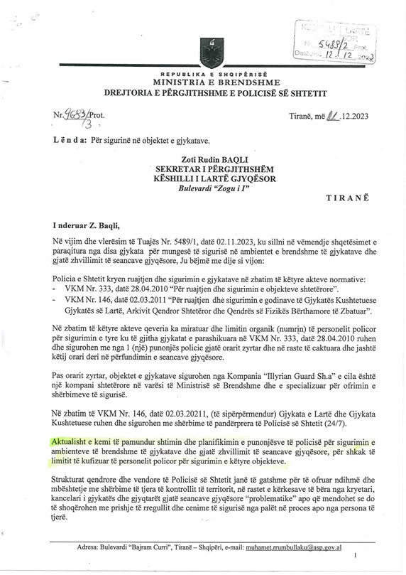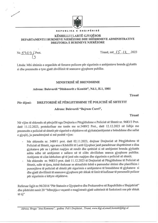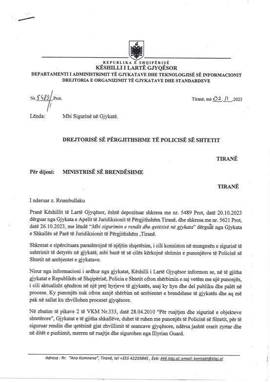 Pas kësaj përgjigjeje, Këshilli i Lartë Gjyqësor, me shkresën nr. 5489/3 Prot., datë 15.12.2023, i është drejtuar zyrtarisht Ministrisë së Brendshme, duke kërkuar ndërhyrje urgjente: