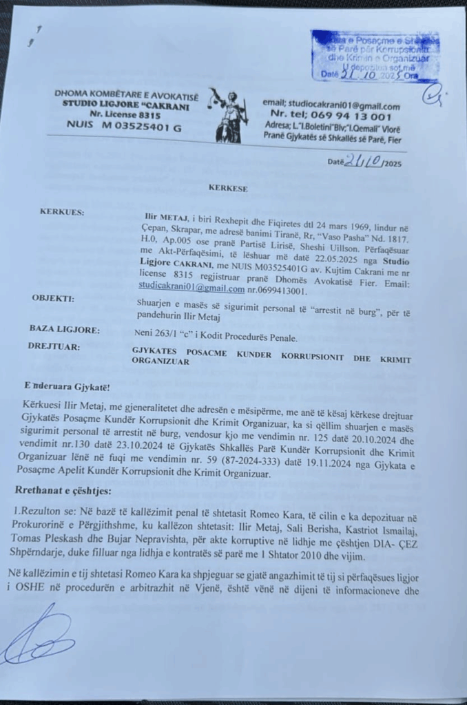 Fiks një vit (21 tetor 2024) nga arrestimi i ish-Presidentit Ilir Meta, avokati i tij, Kujtim Cakrani, i është drejtuar sërish Gjykatës së Posaçme Kundër Korrupsionit dhe Krimit të Organizuar me një kërkesë për shuarjen e masës së sigurisë ndaj tij. Kërkesa është dorëzuar një vit pas vendimit të GJKKO-së, e cila më 21 tetor 2024 miratoi kërkesën e SPAK për arrestimin e Metës.