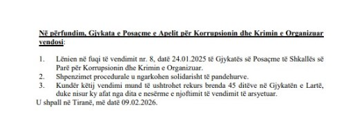 Lënien në fuqi të vendimit nr. 8, datë 24.01.2025 të Gjykatës së Posaçme të Shkallës së Parë për Korrupsionin dhe Krimin e Organizuar. Shpenzimet procedurale u ngarkohen solidarisht të pandehurve. Kundër këtij vendimi mund të ushtrohet rekurs brenda 45 ditëve në Gjykatën e Lartë, duke nisur ky afat nga dita e nesërme e njoftimit të vendimit të arsyetuar”,  thuhet në njoftimin e Apelit.