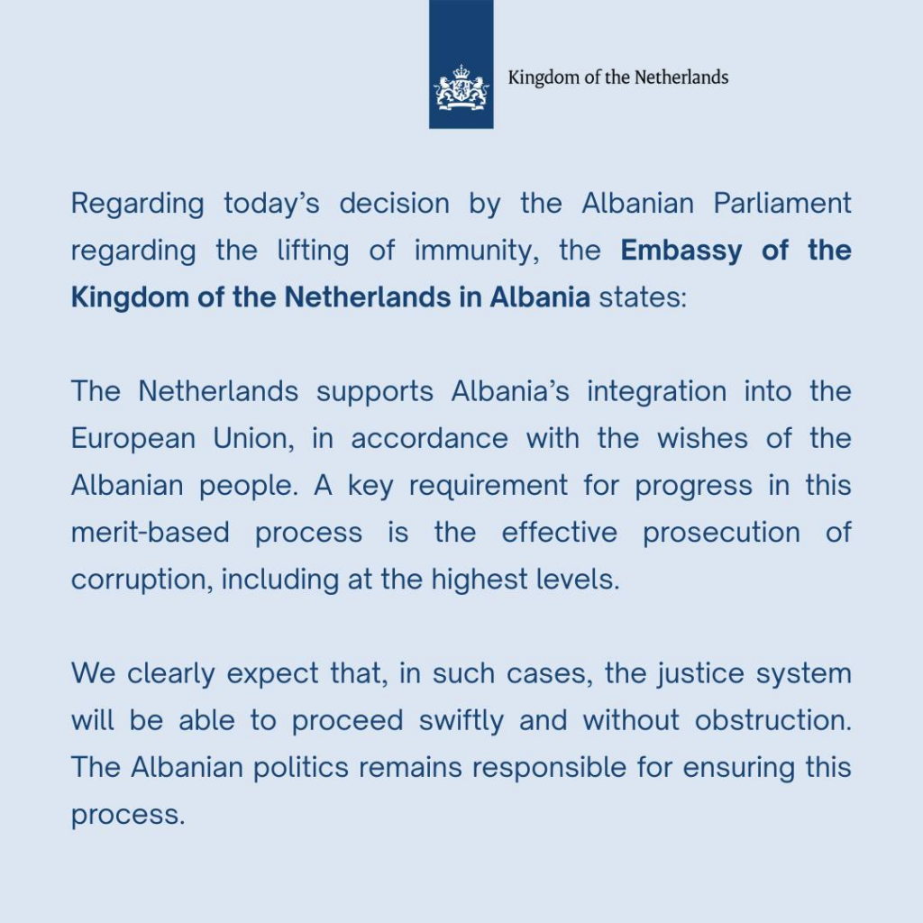 Ambasada e Mbretërisë së Holandës në Shqipëri ka reaguar lidhur me vendimin e sotëm të Kuvendit të Shqipërisë, i cili rrëzoi kërkesën e SPAK për heqjen e imunitetit të Belinda Ballukut.