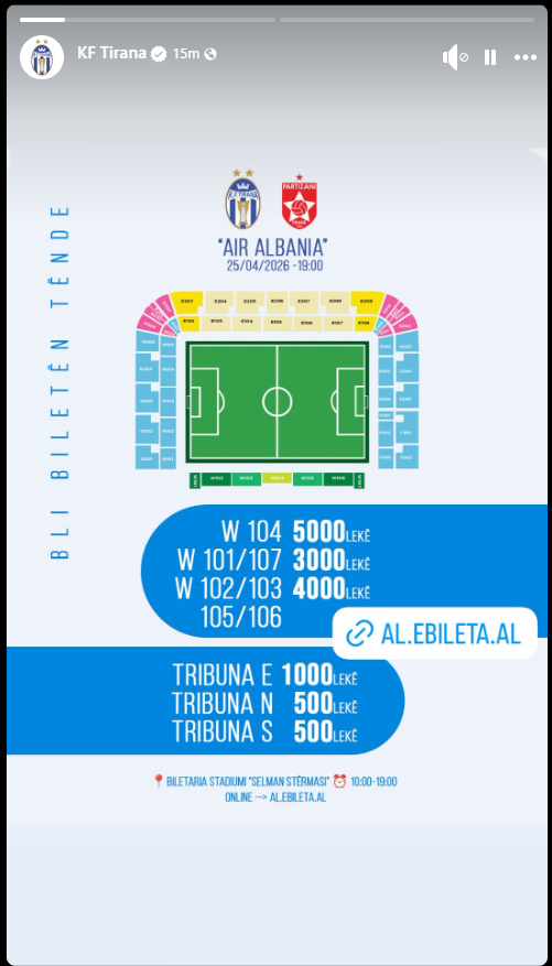 Tirana ka publikuar çmimet e biletave për derbin e fundit të sezonit kundër Partizanit, që do të luhet në stadiumin “Air Albania” më 25 prill në orën 19:00.
